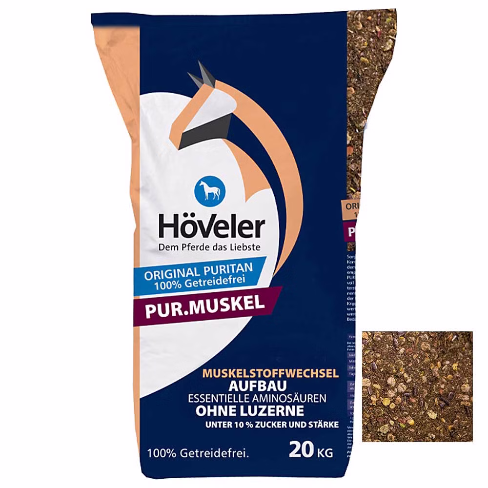 Höveler Pur. Muskel ist ein Müsli für Pferde. Höveler Pur. Muskel ist ein energie- und proteinreiches Müsli ohne Luzerne zur ernährungsbedingten Unterstützung der Muskulatur. Das schmackhafte Spezial-Müsli ist ohne zusätzliche Vitamine und Mineralstoffe konzipiert worden - so kann es sehr gezielt in die individuelle Ration des Pferdes eingebaut werden.