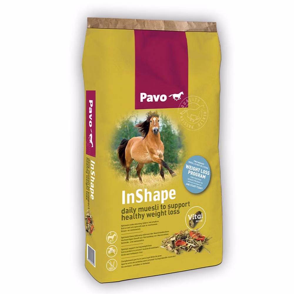 Pavo InShape ist ein vollständig vitaminisiertes Müsli mit natürlichen Antioxidantien. Es wurde speziell entwickelt, um Pferde beim Abnehmen optimal zu unterstützen. Der hohe Eiweißanteil in Pavo InShape sorgt dafür, so dass sich die Muskeln nach einer Anstrengung schnell regenerieren können und Muskelabbau verhindert wird. Es enthält darüber hinaus die essentielle Aminosäure Methionin, welche die Fettverbrennung fördert. Mit Pavo InShape versorgst du dein Pferd, dank der enthaltenen Pavo Vital Pellets, außerdem mit allen Vitaminen, Mineralstoffen und Spurenelementen, die es täglich benötigt. Es ist getreidefrei und hat einen sehr niedrigen Zucker-, Stärke- und Energiegehalt. Im Kampf gegen die Kilos ist es wichtig, dass dein Pferd keine zusätzliche Energie erhält.