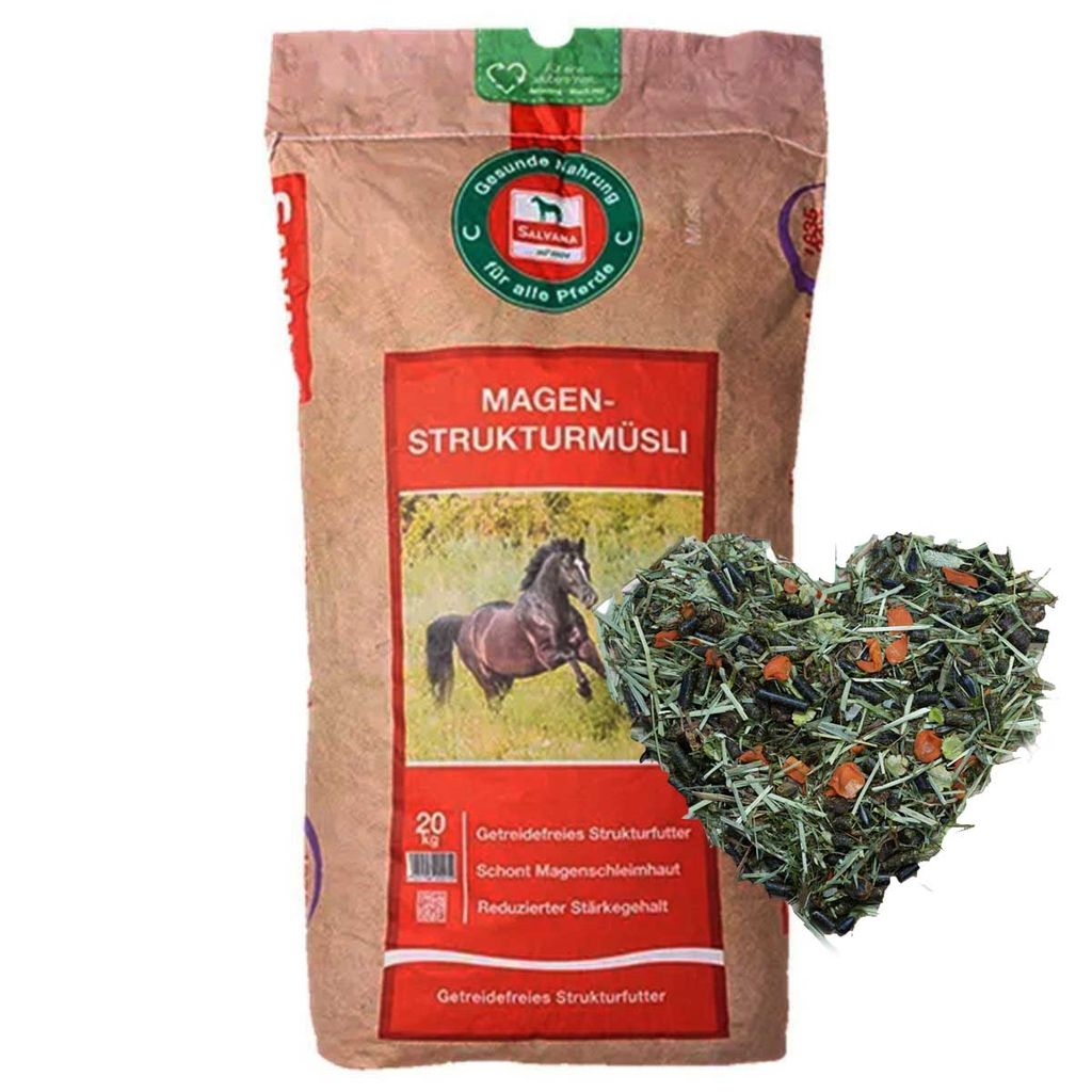 Salvana Magen-Strukturmüsli ist ein Strukturmüsli, insbesondere geschaffen für magenempfindliche Pferde. Es enthält strukturierte, darmverträgliche Fasern, die die Speichelproduktion anregen und fördern und somit auch die Magenfunktion. Timotheeheu kann aufgrund seiner Struktur intensives Kauen unterstützen und aufgrund seiner weicheren Beschaffenheit die Magenschleimhaut schonen. Spezielle sekundäre Pflanzenstoffe (Tannine) aus Esparsette können die Verdauung in Kombination mit Johannisbrot und Karottenflocken fördern. Das weite Ca:P-Verhältnis (4,3:1) kann für einen Calciumüberhang und damit für die Neutralisation überschüssiger Magensäure sorgen.