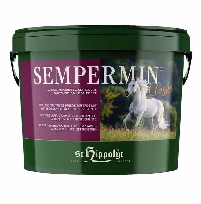 St Hippolyt SemperMin stellt alle notwendigen Vitamine, Mineralstoffe, inklusive Spurenelemente für einen vitalen Stoffwechsel zur Verfügung. Der moderate Calciumgehalt ist angepasst an den niedrigen nativen Phosphorgehalt. Magnesium in organischer Bindung sorgt für eine lockere Muskulatur und ein entspanntes Nervenkostüm. Die enthaltenen Spurenelemente Zink, Kupfer und Mangan sind essentiell für gesunde Haut, ein glänzendes Haarkleid und stabile Hufe. Cobalt liegt in einer besonderen Bindungsform vor, die eine optimale Ausnutzung der aufgenommenen Nährstoffe bietet. Das Darmmilieu wird dadurch stabilisiert und die zellolytischen Mikroorganismen gefördert, so verbessert sich ebenfalls die Cobalt-abhängige Synthese von Vitamin B 12. Als Antioxidantien wirken Vitamin E und Selen Übersäuerung und freien Radikalen durch oxidativen Stress entgegen, wertvolle Omega-3 und Omega-6-Fettsäuren unterstützen zusätzlich das Wohlbefinden des Pferdes. In Kombination mit Heu, Getreide oder einem Basiskrippenfutter deckt SemperMin® fütterungsbedingte Versorgungsdefizite. Die flexible Fütterungsdosierung erlaubt die balancierte Versorgung aller Pferderassen.