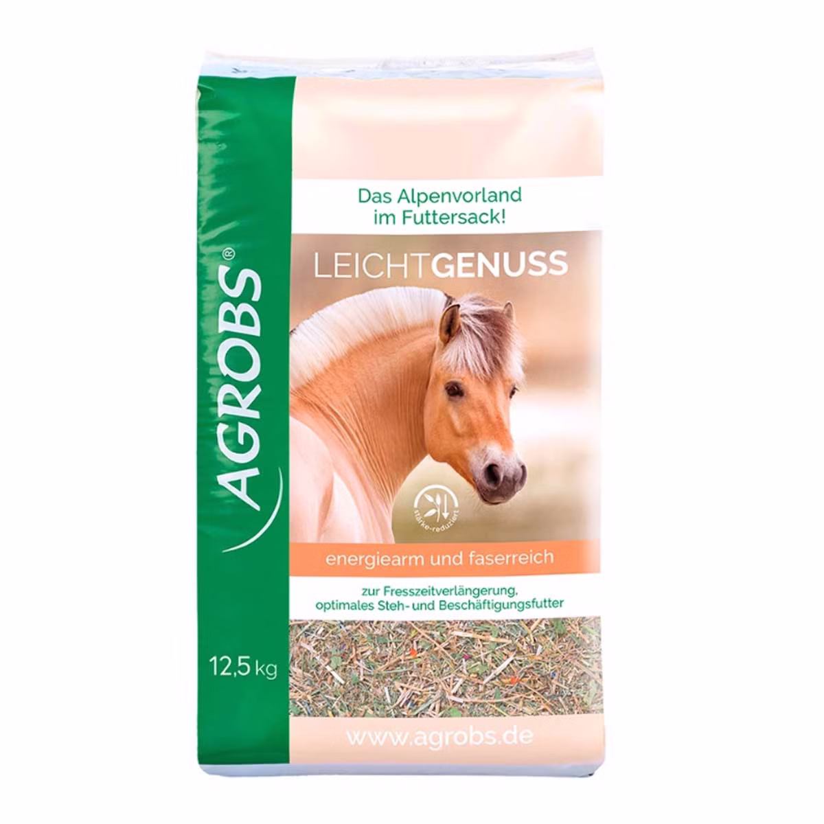 Agrobs LeichtGenuss besteht aus energiearmen Wiesengräsern und -kräutern, Grünhafer sowie hochwertiges Stroh. Der hohe Strukturanteil verlängert die Fressdauer, hält das Pferd beschäftigt und sorgt zudem für mehr Kauaktivität. So wird die Speichelproduktion angeregt. Der hohe Gehalt an Fasern begünstigt somit die gesamten Verdauungsvorgänge.