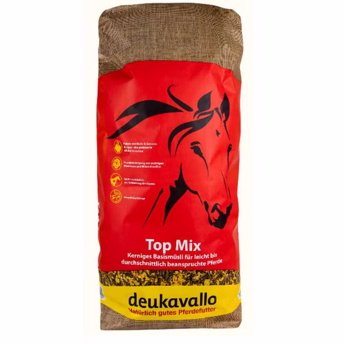 deukavallo Top Mix ist ein haferfreies Basismüsli für alle Pferde und alle Altersklassen bei leichter bis mittlerer Arbeit. Das ausgewogene und vollwertige Müslifutter sichert die Grundversorgung des Pferdes mit allen wichtigen Vitaminen und Mineralstoffen. So können Pferdehalter*innen auf die zusätzliche Gabe eines Mineralfutters verzichten. Das kernige Krippenfutter ist eine preiswerte Alternative zum klassischen Pferdemüsli und lässt sich bei Bedarf problemlos mit anderen Müslifuttern kombinieren.