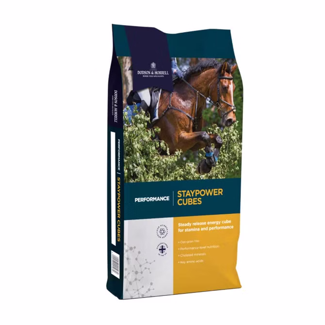 Dodson & Horrell Staypower Cubes ist ein pelletiertes Leistungsfutter, das besonders für Ausdauersportarten wie Distanzreiten geeignet ist. Durch seinen hohen Rohfaseranteil und den geringen Stärkegehalt, wird mit Staypower Cubes Energie nur sehr langsam freigesetzt, wodurch auch am Ende eines Wettbewerbes noch Energiereserven beim Pferd vorhanden sind.