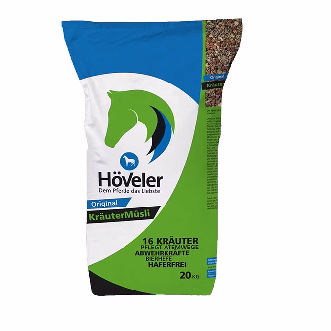 Moderate Gehalte an verdaulichem Eiweiß und verdaulicher Energie sowie deren enges Verhältnis zueinander machen das Müsli zu einer universellen Beilage zu den unterschiedlichsten Rationen. Die besonders schmackhafte Rezeptur ist mit allen Mengenelementen, Vitaminen und Spurenelementen optimiert. Durch hochwertige Pflanzenöle ist das Original KräuterMüsli ein absolut staubfreies Futtermittel, das sich auch für empfindliche Pferde bestens eignet. Das Original KräuterMüsli ist wie alle Kraftfuttersorten der Firma Höveler ADMR-konform!