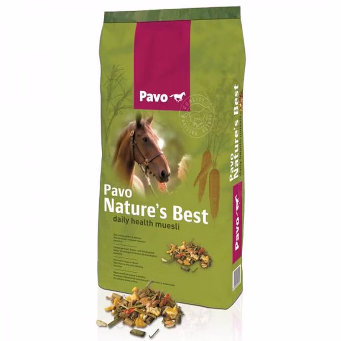 Pavo Nature’s Best ist ein schmackhaftes, strukturreiches Müsli mit wenig Zucker und Stärke. Es besteht aus einer gesunden Basis aus Dinkel, Luzerne und Timotheegras. Timotheegras ist eine Grassorte mit wenig Fruktan (Zucker), die sehr nahrhaft für Pferde ist. Durch die Ballaststoffe ist Pavo Nature’s Best besonders gut verdaulich. Außerdem sorgen diese dafür, dass die Pferde besonders lang darauf kauen.