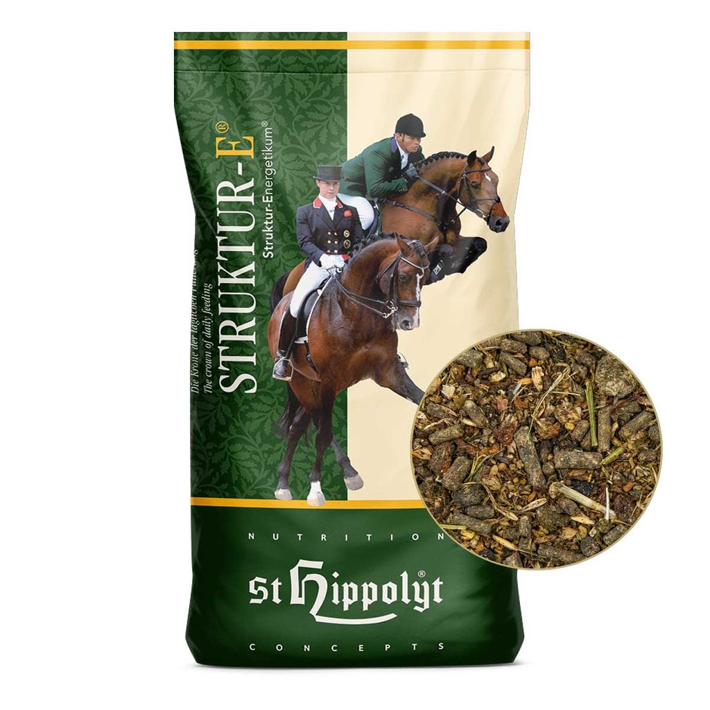 Als Ergänzung zur Grundfutterversorgung mit Raufutter und/oder Weidegras. Ab einer Menge von ca. 150-300 g je 100 kg Körpergewicht und Tag ist keine zusätzliche Mineralfuttergabe notwendig. Bei Kleinpferden, Ponys und Pferden mit einem geringen Energiebedarf kann Struktur-E® als alleiniges Krippenfutter eingesetzt werden. Für stark beanspruchte Sportpferde empfehlen wir die Kombination mit anderen St. Hippolyt® Krippenfuttermitteln und/oder Getreide. Die Gesamtmenge sollte auf mehrere Rationen verteilt angeboten werden. Bei geringerer Dosierung oder Versorgungsdefiziten empfehlen wir die Zugabe von SemperMin® oder MicroVital®.