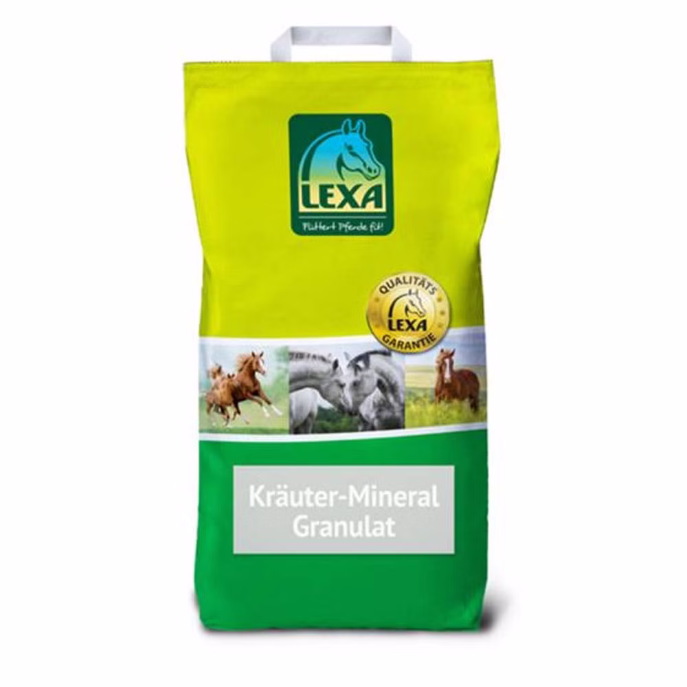 Lexa Kräuter-Mineral Granulat ist ein granuliertes Mineralfuttermittel zur Grundversorgung von Pferden mit allen lebenswichtigen Mineralstoffen, Vitaminen und Spurenelementen.