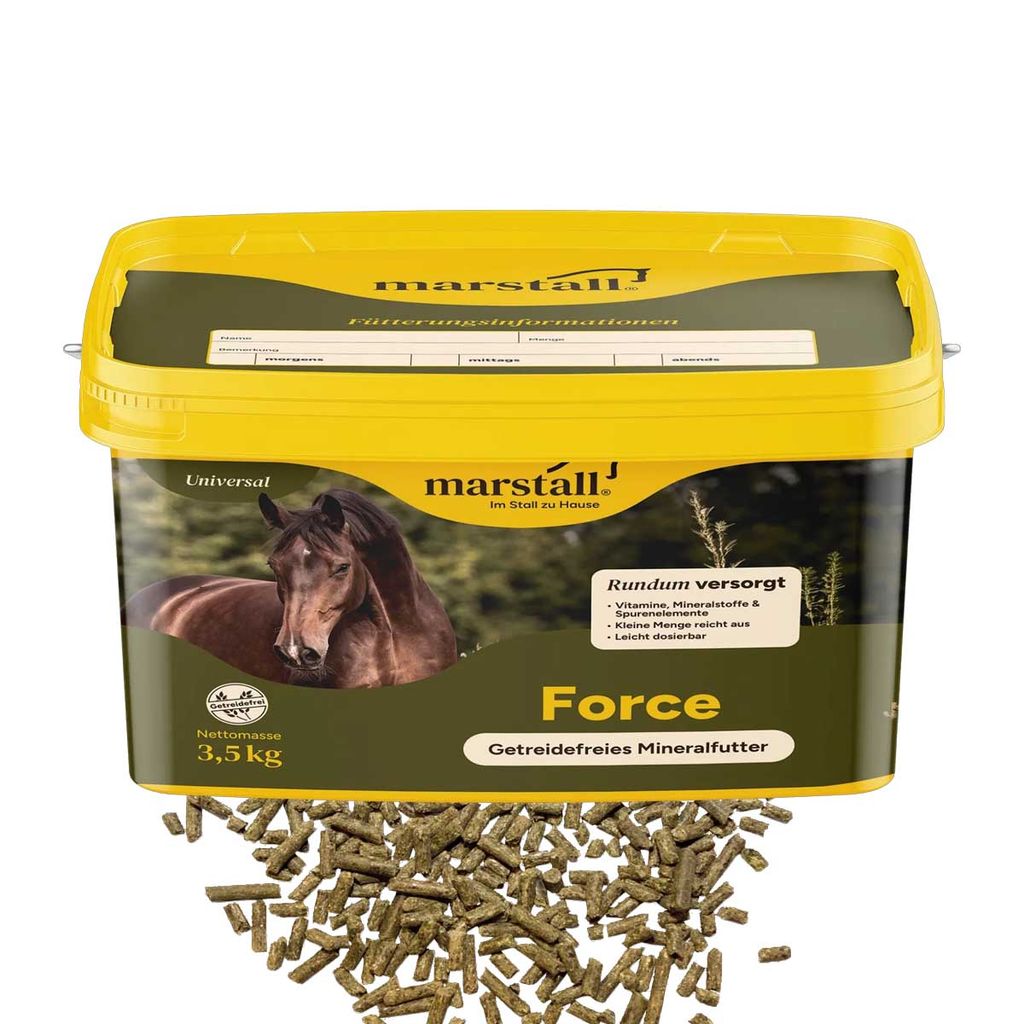 marstall Force ist ein Premium-Mineralfutter mit konzentrierten Gehalten an Mineralstoffen, Vitaminen und Spurenelementen. Die extrakleinen Pellets sind sehr schmackhaft, enthalten wertvolle Bierhefe und kein Getreide.