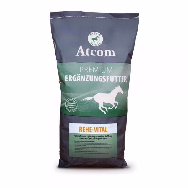 Besonders wichtig ist eine hohe Versorgung an Vitamin E, Selen und Spurenelementen, welche aufgrund ihrer antioxidativen Wirkung einen zuverlässigen Zellschutz darstellen. Stoffwechselempfindlichkeiten gehen häufig auch mit Belastungen des Darms einher, welches zur Einschränkung der Eigensynthese an Vitamin C und den B-Vitaminen führt. Eine Ergänzung dieser wasserlöslichen Vitamine ist somit zur Unterstützung des gesamten Zellstoffwechselgeschehens sehr empfehlenswert. Da die Gruppe der empfindlichen Pferde, laut aktuellen Studien, einen erhöhten Bedarf an Magnesium hat, ist in Atcom Rehe-Vital eine spezielle Kombination aus hochwertigem organischen und anorganischem Magnesium enthalten. Magnesium ist u.a. für die Enzymfunktion und die Durchlässigkeit der Zellmembran unentbehrlich. Blutuntersuchungen ergaben oft einen erniedrigten Magnesiumspiegel im Blut dieser Pferde. Außerdem enthält Atcom Rehe-Vital eine hochwertige Versorgung mit dem organischen Spurenelement Zink, da Zink in wichtigen Prozessen im Kohlenhydrat-, Protein- und Fettstoffwechsel eine Schlüsselrolle spielt. Störungen der Darmflora und Belastungen der Leber, Belastungen des Stoffwechsels und des Immunsystem sowie Stress kann zu einem individuellen Mehrbedarf an Zink führen. Da Zink u.a. das physiologische Wachstum des Hufhorns unterstützt, ist eine ausreichende Versorgung unerlässlich, die über die Gabe von Atcom Rehe-Vital optimiert wird. Leinsamen und Leinöl sowie weitere Pflanzenöle liefern essentielle ungesättigte Fettsäuren, insbesondere Omega-3-Fettsäuren. Bei empfindlichen Pferden ist es wichtig die Hufhornbildung ernährungsseitig zu unterstützen. Deshalb liefert Atcom Rehe-Vital zusätzlich essentielle Aminosäuren, die zum einen den Muskelstoffwechsel (Lysin) und zum anderen die Hufhornqualität (Methionin, Cystein) unterstützen können. Zugesetztes Lecithin und B-Vitamine unterstützen den Leber - und Kohlenhydratstoffwechsel. Zudem kann Lecithin die Elastizität und die Feuchtigkeit des Hufhorns verbessern. Atcom Rehe-Vital ist mit Bentoniten angereichert.