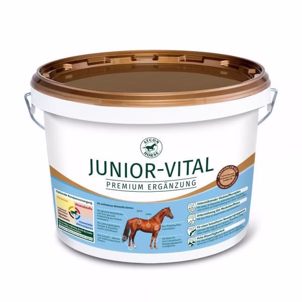 Atcom Junior-Vital ist ein komplettes Mineralfutter in Premium-Qualität sichert in hochverfügbarer Form den Grundbedarf an allen essentiellen Mineralstoffen, Vitaminen, Spurenelementen und Aminosäuren des Jungpferdes (vom 2. Lebensmonat bis zur Vollendung des 3. Lebensjahres) und beugt ernährungsbedingte Mangelerscheinungen zuverlässig vor.