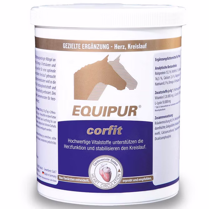 Equipur corfit gleicht fütterungsbedingte Mängel an Vitamin E, Selen, Carnitin, Omega-3-Fettsäuren und Procyaniden wirksam aus, welche für eine optimale Herzfunktion und einen stabilen Kreislauf gebraucht werden. In Verbindung mit den Herzkräutern wird so die körperliche Belastbarkeit, die Leistungsbereitschaft und das Wohlbefinden des Pferdes nachhaltig verbessert. Dies gilt besonders in den heißen Sommermonaten für herzkranke oder alte Pferde (Altersherz).