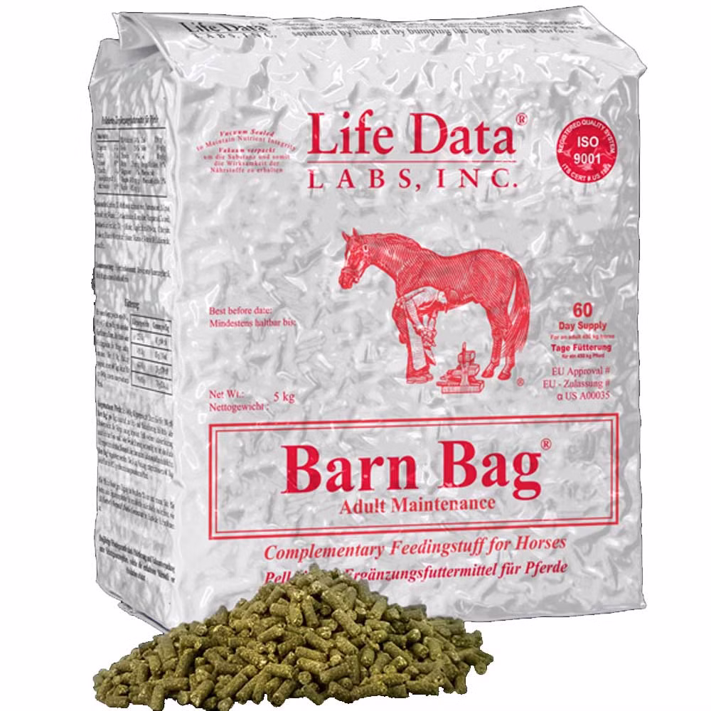 Life Data Labs Barn Bag ist ein pelletierter, stärke- und kalorienarmer Futterzusatz, der dem Pferd täglich eine definierte Menge wichtiger Vitaminen, Mineralien, Aminosäuren und Fettsäuren liefert, die häufig im Pferdefutter fehlen. Für diesen wichtigen Ausgleich wurde dieses Ergänzungsfuttermittel entwickelt. Pferdebesitzer können dem Pferd Heu verfüttern und die notwendigen Nährstoffe mit Hilfe von Barn Bag dazu geben.