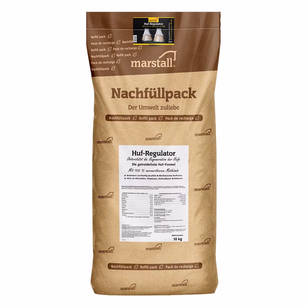 Im Gegensatz zu klassischen Huf-Zusatzfutterprodukten auf Basis übermäßiger Biotin-Gaben, geht Marstall mit Huf-Regulator einen natürlichen Weg. Durch mehrjährige Zusammenarbeit mit Tierärzten und Hufschmieden wurde die Rezeptur aus hochwertigen und Zutaten ermittelt. Huf-Regulator führt dem Pferd eine Vielzahl an organischen Nahrungsbausteinen in hoher biologischer Verfügbarkeit zu. Es enthält eine spezielle Mischung aus Vitaminen, Mineralien, Proteinen (hoher Anteil an Bierhefe), Vitalstoffen, Kräutern und organischen Spurenelementen (Zink, Kupfer, Mangan)