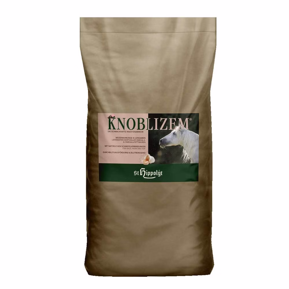 St.Hippolyt Knoblizem ist ein Ergänzungsfuttermittel für insektengeplagte Weidepferde bestehend aus eine gelungenen Kombination von Knoblauch bester Qualität, Kräutern wie Rosmarin, Pfefferminze, Koriander sowie Vitaminen des B-Komplexes. Es steht dem Pferd eine ausgewogene und nicht zu scharfe Knoblauchquelle zur Verfügung. Weizenkeime und Leinsamen liefern natürliches Vitamin E, Verdauungsenzyme und wertvolle essentielle Fettsäuren.