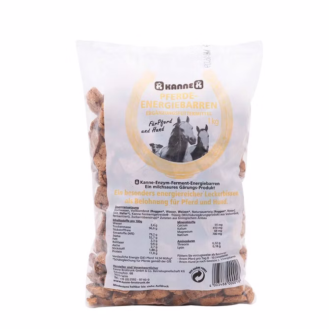 Kanne Ferment Enzym Energiebarren im 25kg-Sack ist ein beliebtes Leckerli für Pferde und Hunde. Hier erhalten Sie es im 25kg Sack. Sie sind ein Qualitätsprodukt und werden auf traditionelle Art im Backofen gebacken. Die Kanne Energiebarren sind hervorragende Energiespender und gleichzeitig eine leckere Belohnung. Kanne Energiebarren sind frei von synthetischen Zusatz- und Konservierungsstoffen. Durch Zusatz von Kanne Bio Fermentgetreide flüssig für Tiere sind auch in diesem Produkt naturreine Milchsäure und andere wertvolle Inhaltsstoffe enthalten. Kanne Energiebarren sind deshalb leicht verdaulich.