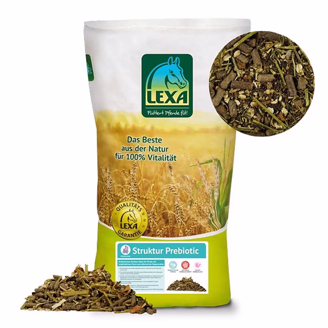 Struktur Prebiotic kann hervorragend mit unserem gesamten LEXA Müslisortiment kombiniert werden, aber auch der Einsatz von Struktur Prebiotic als alleiniges Kraftfutter ist möglich. Struktur Prebiotic ist bewusst nicht mineralisiert, damit dieses Premiummüsli ideal kombiniert werden kann. Ergänzen Sie bei Verwendung als alleiniges Kraftfutter immer gezielt, ein zum Pferd passendes Mineralfutter aus unserem LEXA Mineralfuttersortiment.
