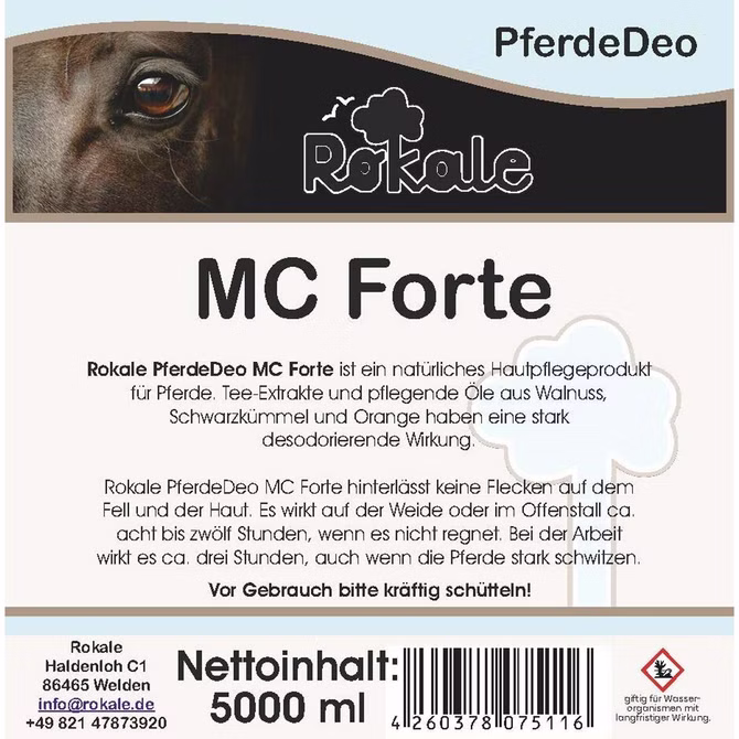 Rokale PferdeDeo MC Forte ist ein natürliches Hautpflegeprodukt für Pferde. Tee-Extrakte und pflegende Öle aus Walnuss, Schwarzkümmel und Orange haben eine stark desodorierende Wirkung. Rokale PferdeDeo MC Forte hinterlässt keine Flecken auf dem Fell und der Haut. Es wirkt auf der Weide oder im Offenstall ca. acht bis zwölf Stunden, wenn es nicht regnet. Bei der Arbeit wirkt es ca. drei Stunden, auch wenn die Pferde stark schwitzen.