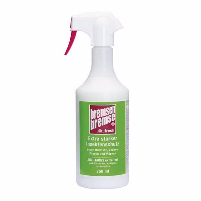 Bremsenbremse ultrafresh wehrt zuverlässig lästige Insekten ab. Gerade die das Pferd oftmals belästigenden Bremsen, Zecken, Kriebelmücken, Fliegen werden gestört. Es enthält Aloe Vera, Sesamöl, Avocadoöl und Walnussöl. Eine extra starke Abwehrwirkung wird durch die Kombination von Geraniol und dem seit 30 Jahren bewährten Breitband-Insekt-Repellent IR3535® erreicht. Darüber hinaus duftet es charakteristisch holzig durch die Mischung ätherischer Öle. Im Wettkampf dopingfrei.