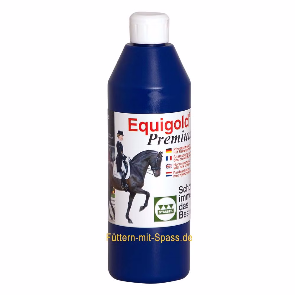 Equigold Premium - Ihre „Versicherung“ für ein tadellos gepflegtes Fell ist angereichert mit Seidenproteinen - Sehen und fühlen Sie auf Ihrem Pferd das streichelnde Gefühl und den schmeichelnden Glanz wie von reiner Seide. Equigold Premium schenkt der Haut beim Waschen das Wohlgefühl eines angenehmen Sommerregens und lässt das Fell als Visitenkarte eines gepflegten Pferdes schimmern.
