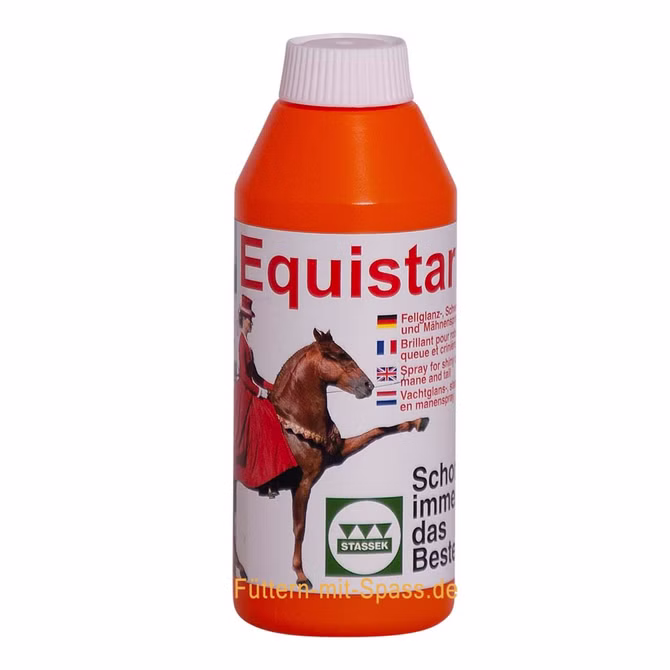 Stassek Equistar ist ein hervorragendes Fellglanz-, Schweif- und Mähnenspray für Pferde. Stassek Equistar erzeugt ein seidenweiches Fell und rein optisch einen strahlenden Glanz auf Fell, Schweif und Mähne.